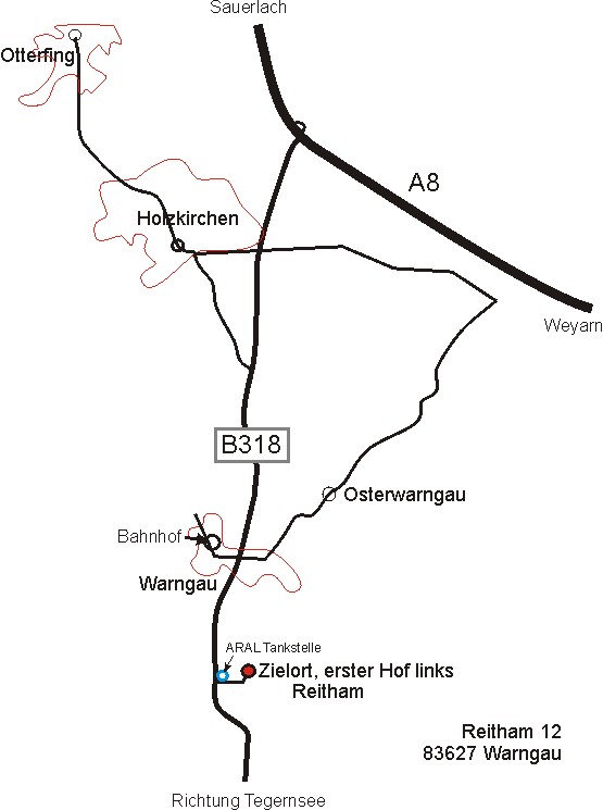 Fahren Sie von Holzkirchen kommend, auf der B318, Richtung Tegernsee. Kurz nach Warngau kommt auf der linken Seite eine ARAL Tankstelle. Unmittelbar nach der Tankstell links, Richtung Reitham. In Reitham gleich der erste Hof links.